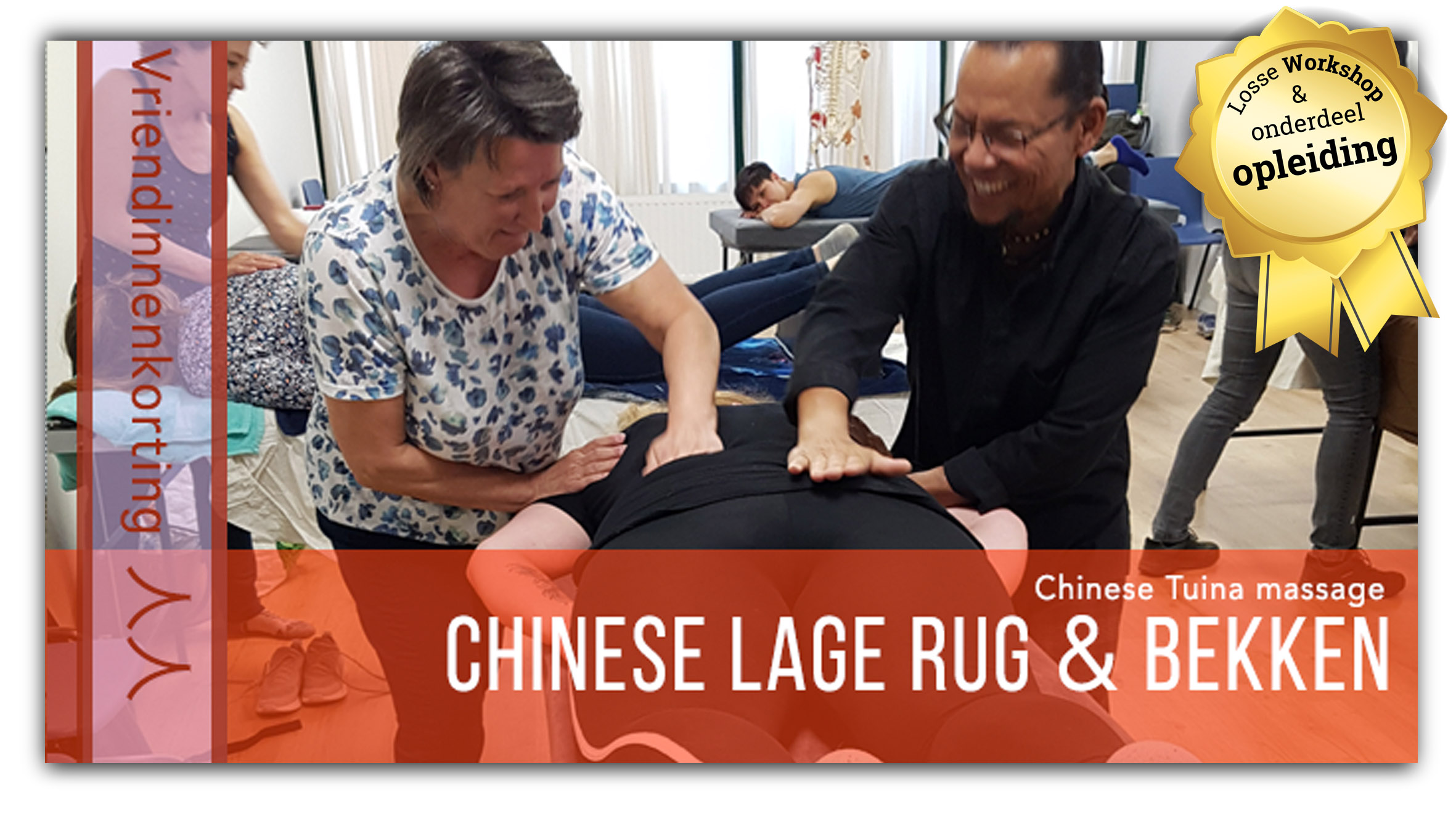Chinese Lage rug en Bekken is ook te volgen als onderdeel van de TUINA chinese massage PRACTITIONER opleiding (1 van de 7 workshops). Zie voor meer info >>> LINK