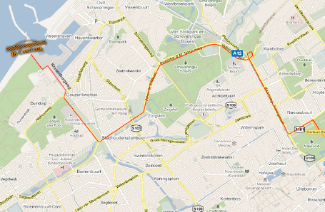 Na drie stoplichten rechtdoor te zijn gegaan, bij de borden ‘Kijkduin Scheveningen Haven’en stoplichten; rechtsaf,